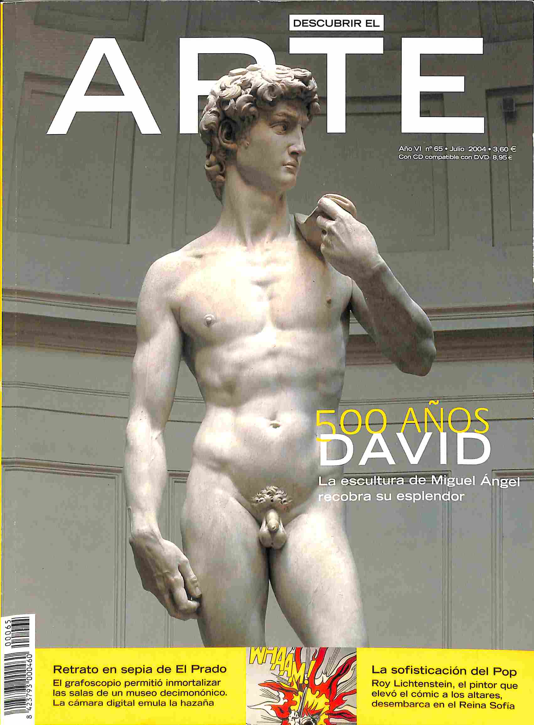Contiene: 500 años David, la escultura de Miguel Ángel recobra su esplendor; Retrato en sepia de el Prado, el grafoscopio permitió inmortalizar las salas de un museo decimonónico. La cámara digital emula la hazaña; La sofisticación del Pop, Roy Lichtenstein el pntor que elevó el cómic a los altares desembarca en el Reina Sofia