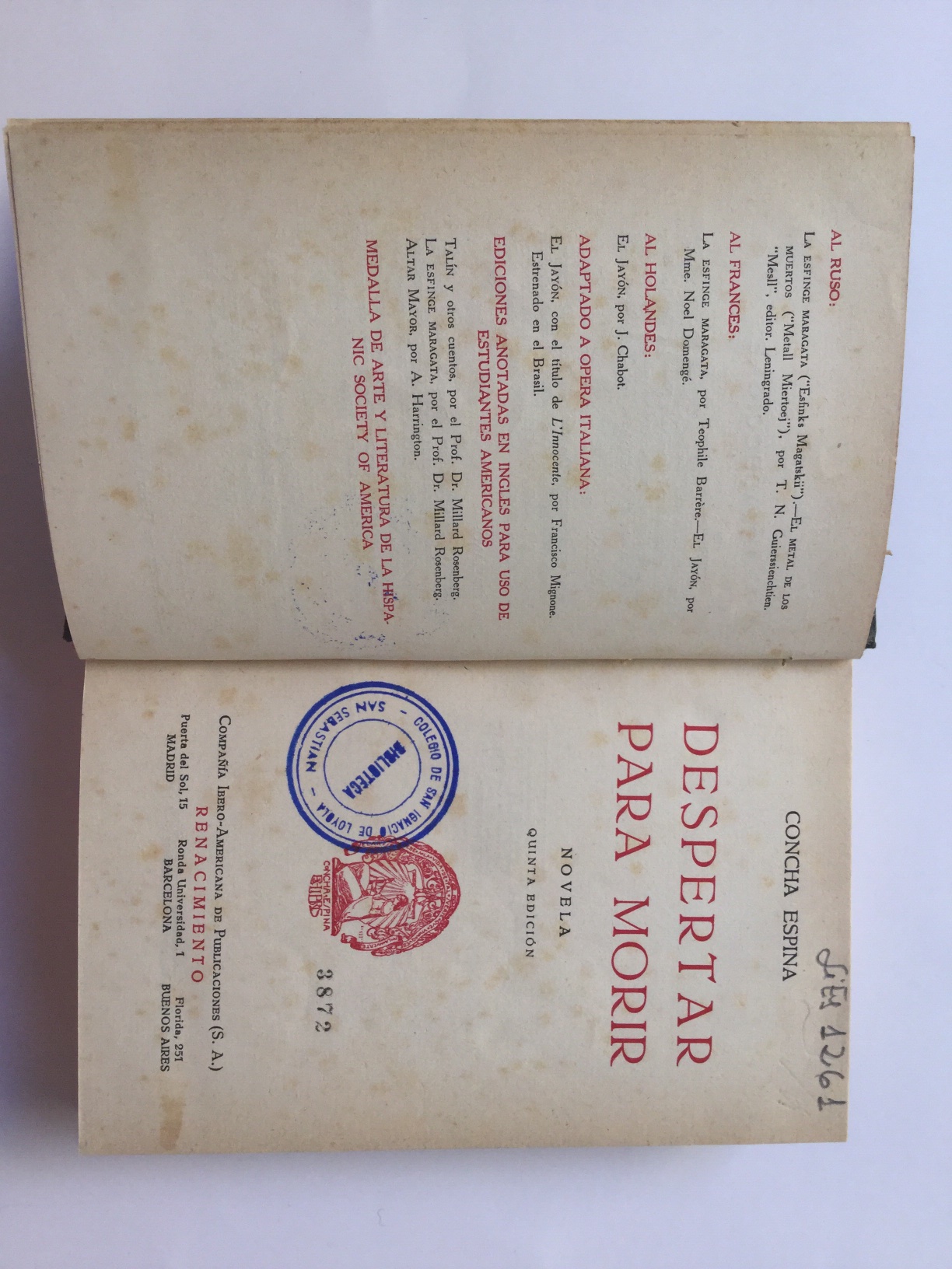 Tejuelo y sellos anteriro bibliotecaConserva cubierta original
