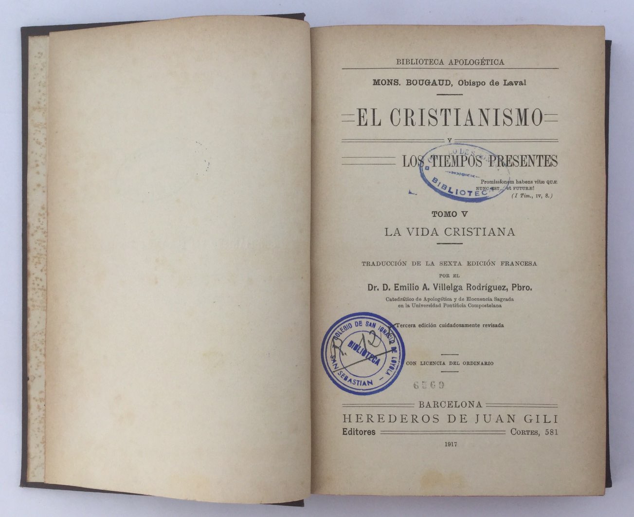 Biblioteca apologética. Trad. Emilio Villelga Rodríguez. Tela estampada con dorados. Cortes tintados. Sello anterior biblioteca.