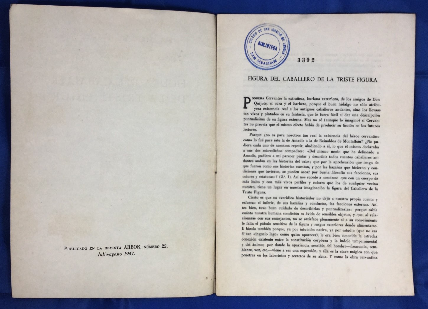 Separata de la Revista ARBOR, número 22, Julio-agosto 1947. Láminas de ilustraciones fuera de texto. Sello y tejuelo anterior biblioteca