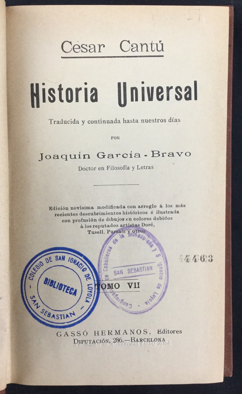 Traducida y continuada por Joaquín García- Bravo. Palau III, 42750, lo fecha en 1908-1911.Tela editorial con dorados y relieves. Sello anterior biblioteca.