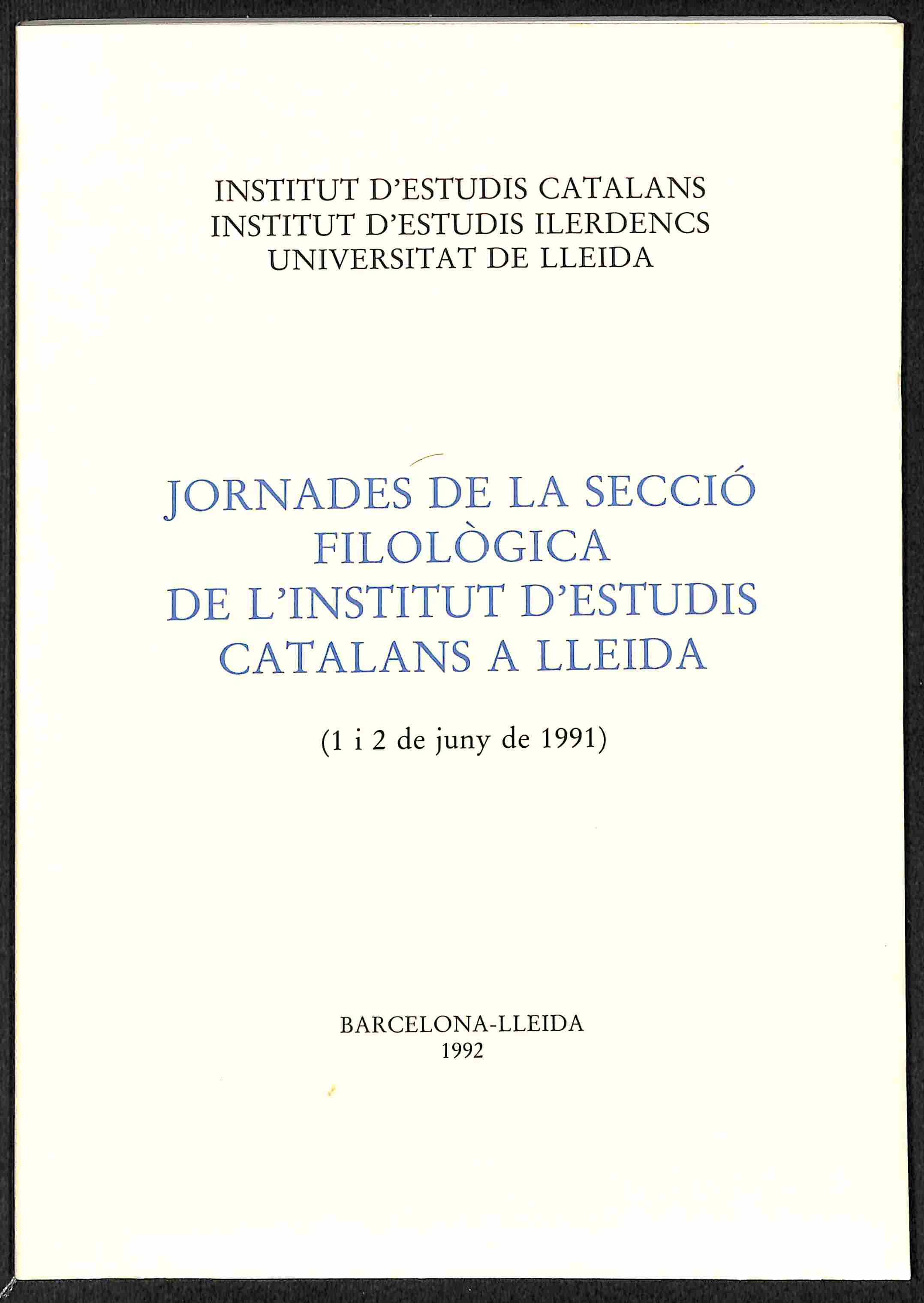Jornades de la Secció Filológica de l'Institut d'Estudis Catalans a Lleida: 1 i 2 de juny de 1991