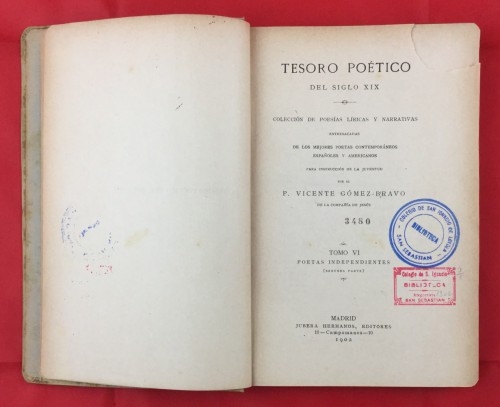 Colección de poesías líricas y narrativas. Entresacadas de los mejores poetas contemporáneos Españoles y Americanos. Para instrucción de la juventud por el P. Vicente Gómez - Bravo de la compañía de Jesús. Tomo IV. Poetas independientes. (Segunda parte). Sello anterior biblioteca.