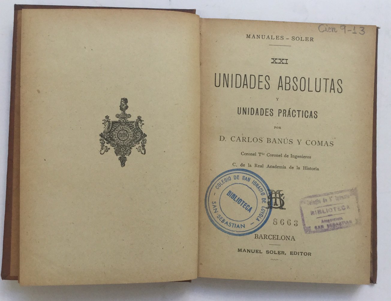 Sellos anterior biblioteca. Lomo con marcas de tejuelo Tela editorial con grabados en lomoa